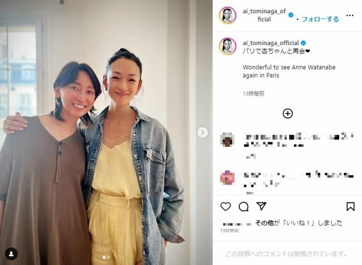 モデルの冨永愛が7月3日にオフィシャルInstagramを更新。女優の杏とパリで再開した際の2ショットを公開した。