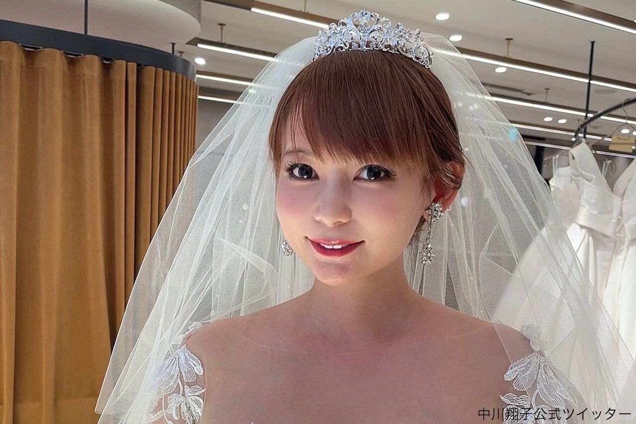4月28日に同年代の男性との結婚を発表した中川。「ウェディングドレスの試着に来ました」とつづり、オフショルダーのデザインで、透け感のある袖にレースが施された真っ白なドレス姿を公開。頭にはベールを付けている。