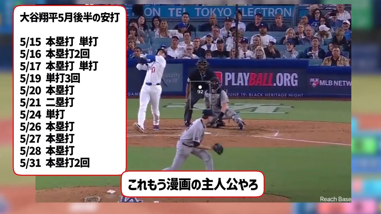 シーズン57試合目での22号は、レギュラーシーズン162試合に換算すると、62・5発ペースとなり、自己最多で2年連続の本塁打王となった昨季の54発を上回り、初の60本に届く勢いだ。4月28〜30日の本拠地・マーリンズ3連戦から10カード連続で本塁打。5月は15発目。ドジャースの球団記録を更新し、5月に限らずとも自身も23年6月にマークした月間15本塁打に並び、1953年8月のスナイダー、85年6月のゲレロがマークしたドジャースの球団記録にも並んだ。